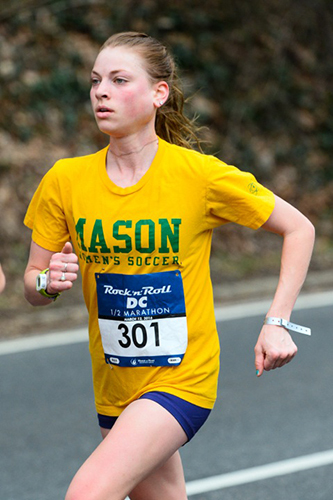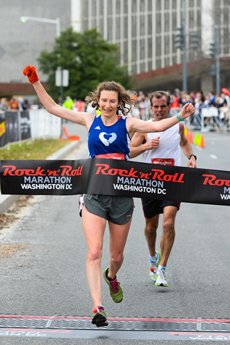 The first woman to cross the half marathon was Bethany Sachtleben who covered the 13.1 miles in 1:19:45, an average of 6:06 per mile. Sachtleben broke the finish-line tape wearing an “old school” yellow T-shirt that read “Mason Women’s Soccer.” Today’s victory was a thrilling experience for the 24-year-old champion from Manassas, Virginia. “Today was amazing,” she said. “These Rock ‘n’ Roll races are always a blast. There is so much support out there. I loved the course, especially when I passed the Georgetown Running Club. They pumped me up when I needed it.”