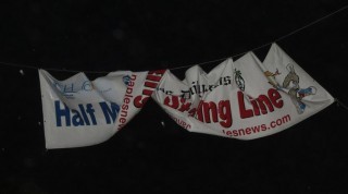 The wind-whipped start line banner of the Naples Daily News Half-Marathon (photo: David Monti/Race Results Weekly)