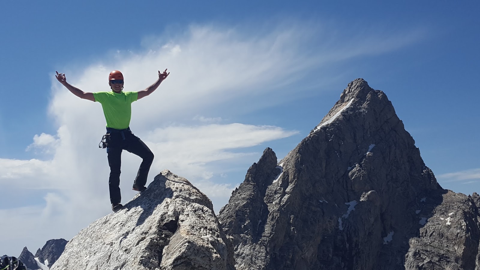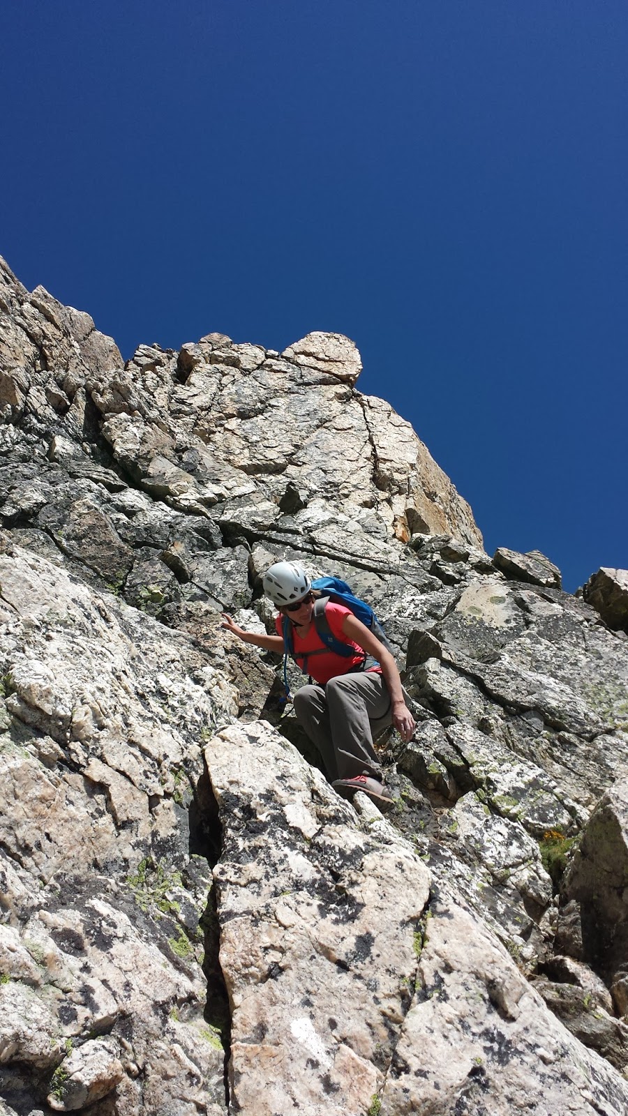 Teewinot is just right of center, rightmost of the main group of mountains.While not a technically demanding route, it does require quite a bit of elevation gain and routefinding. The climbing/scrambling was well within our abilities and we never felt the need to rope up, which did help us move quicker. We were both still tired from the ridge run, so our time overall wasn't great. After getting off route a couple times, we did eventually find the most efficient path up. When we go back next summer for the Cathedral Traverse (first half of the Grand Traverse), we'll be able to do Teewinot in the dark. Our mission was accomplished.