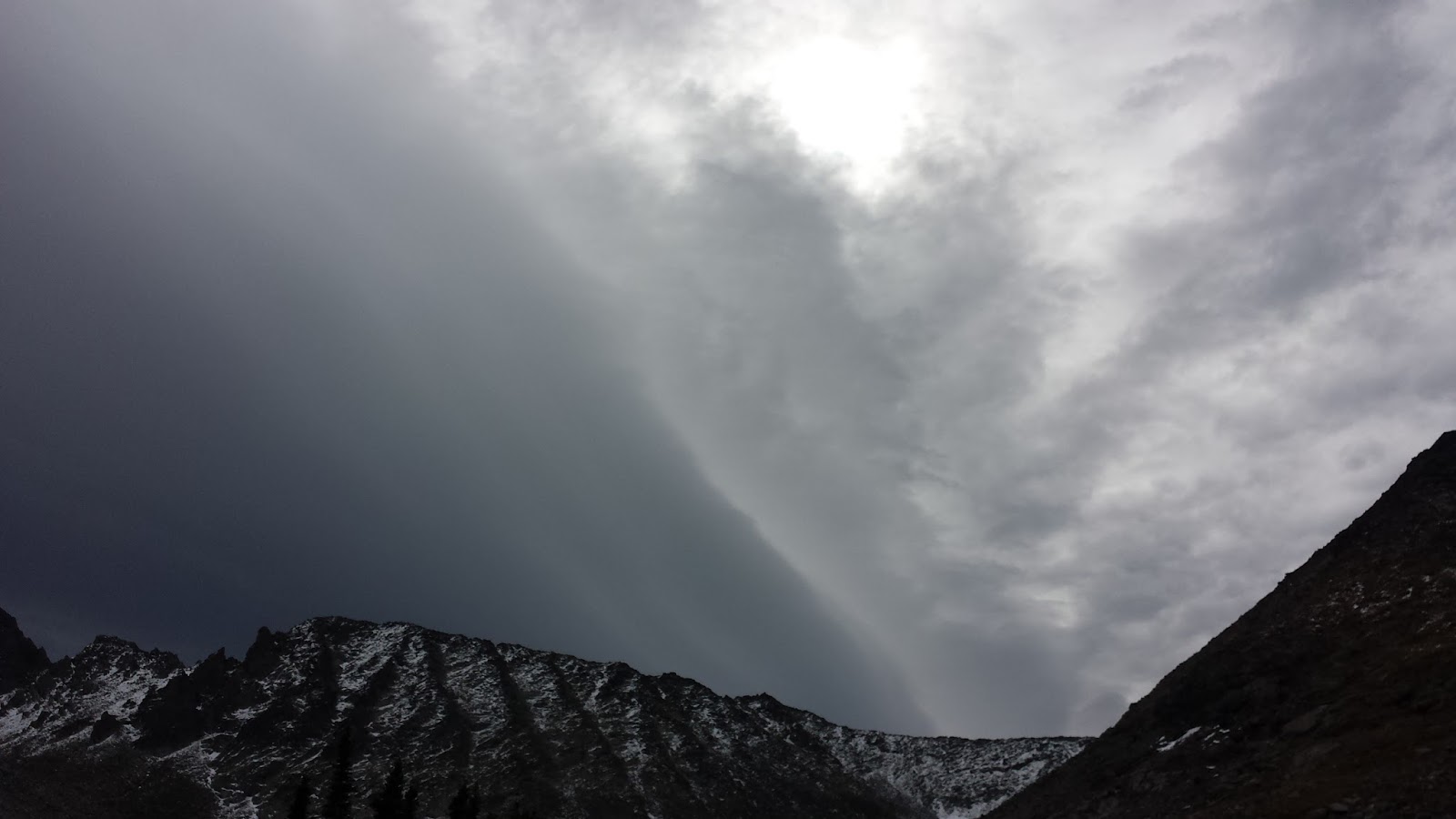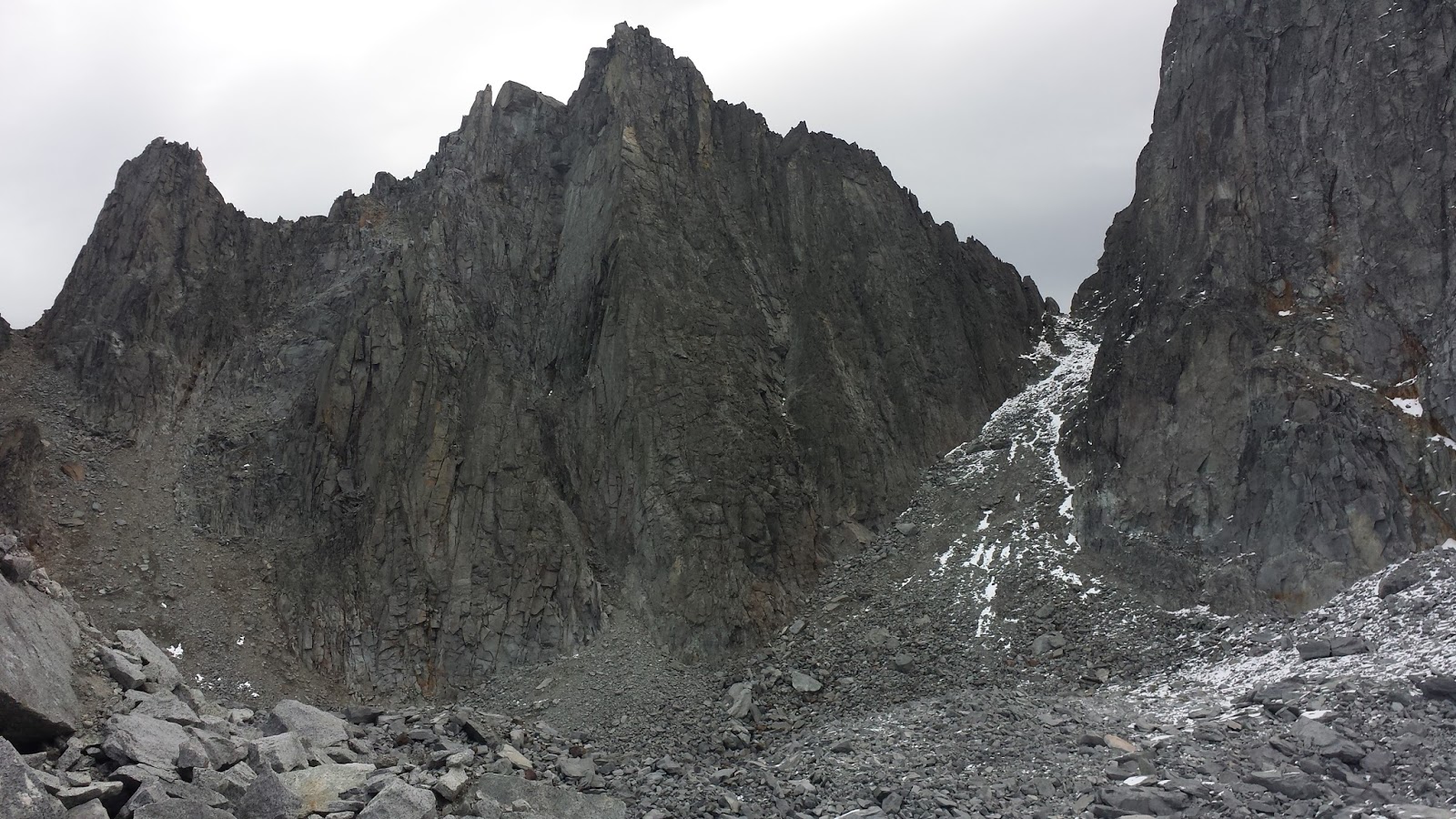 The sun tried to break through once. No luck.The weather, along with time, was beginning to conspire against us. The climb itself faced west, so we hadn't gotten up early, hoping to let it warm up enough to climb without gloves. For the 6 pitches (about 1100 feet) of climbing with vague route info, we'd need at least 6 hours (conservatively). Much of the descent was covered in snow, with unknown difficulties just getting to the part we could see. We still had about 1000 feet to gain through talus and boulders to even get to the start of the route. As we discussed our options, the clouds continued to build overhead, blocking out what little bit of sun that had been coming through.