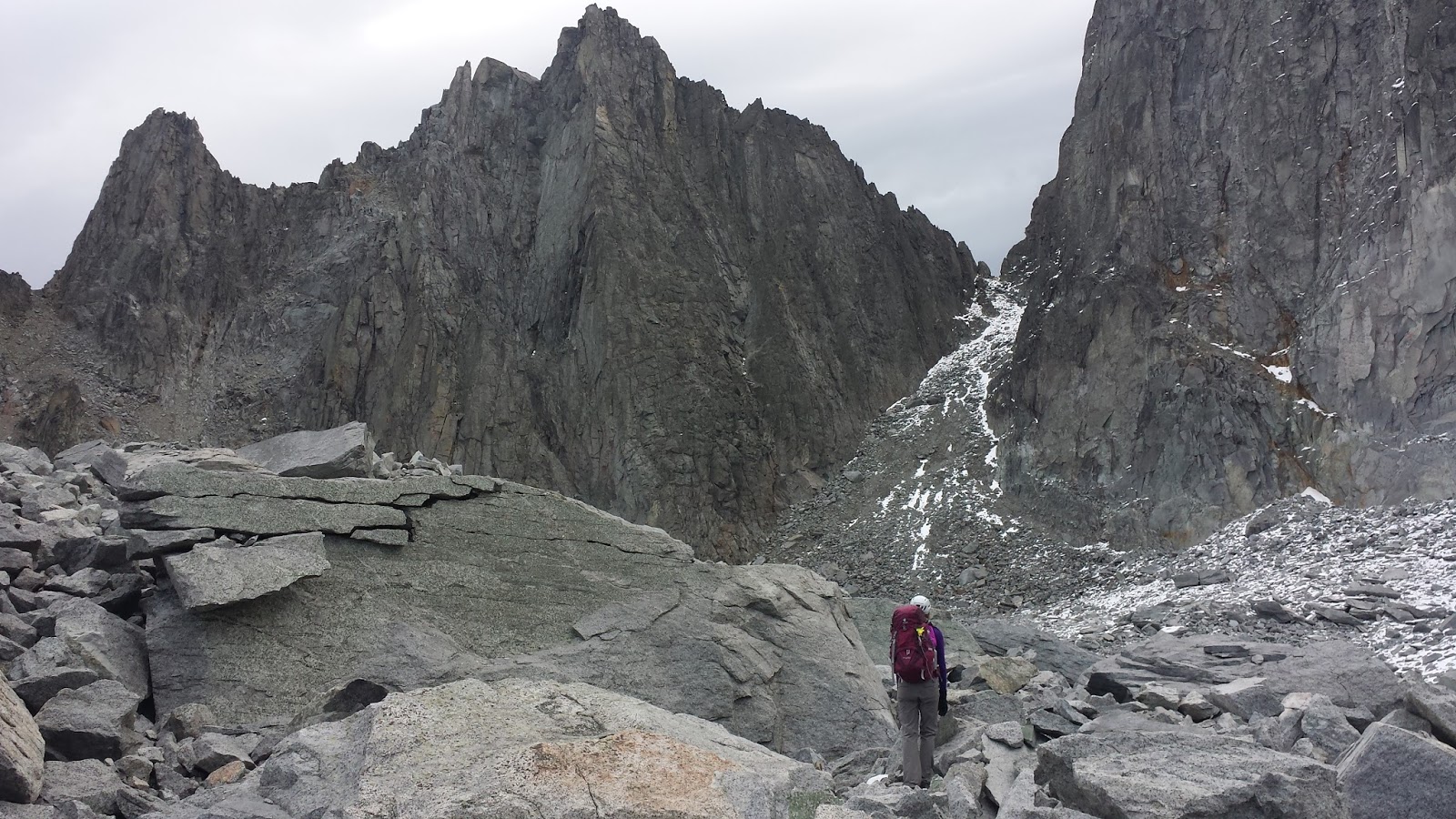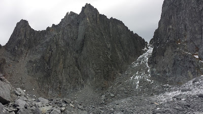 Sarah leads the way through the talus/boulder field.Instead of packing up and heading down the trail right away, we decided to make the trek up to the start of the climb, both for training and so we'd know where it was next time we attempted the route. Once we made it up over the terminal moraine and across several lateral moraines, we got a better glimpse of the route. I really wanted to go, and we'd brought all our gear as training weight, but everything still pointed towards a no go. The wind was blasting and after the few minutes we stopped to look, we were both freezing. The conditions were surpassing our skills.From the second I woke up that morning and heard the wind whipping around us, I'd struggling with a feeling of failure. Each flag and warning that came increased the enormity of it. Were we just not pushing hard enough? Would we look back and be disappointed in ourselves? So many people push through epic conditions and make the summit. Was I just letting my fear and discomfort get in the way?