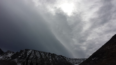 Morning dawned, finally, and the wind started gusting, throwing up a flag in my mind. The already cold day would be made worse with wind chill. I crawled out of the tent to make breakfast and was dismayed to see dark, flat clouds building above us. A second flag went up. Sarah and I talked over the situation as we ate some hot oatmeal with pine nuts and chia seeds.