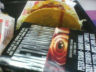 And hence this other picture. About six years ago, I routinely wrote at Barnes and Noble on Saturdays, and would lunch at the Taco Bell next door. I would scarf down tacos and likewise devour horror fiction, both short and novel length, hoping that someday I'd make some sort of headway, have some sort of career.