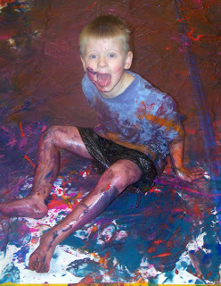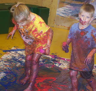 Essentially, it involves playing with paint and making a huge, fun mess. The past several times, Zack just didn't know how to do it. Part of autism involves not knowing "how to play", how to follow instructions or be part of something. All the other times, Zack had to be "forced" to play, or else he'd just run around the room. Also, Madi's sensory issues have always made her very averse to getting dirty...a weird thing for a five year old.