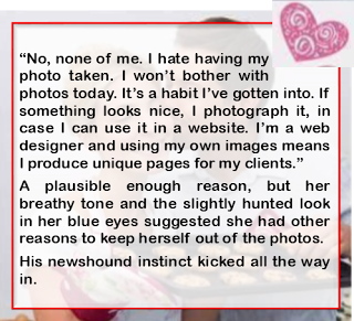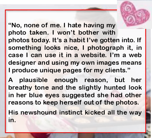 The camera she pulled from her bag looked professional.“Why not let me take the pictures, and then you’ll be in them, too?” Unusually, Meg hadn’t insisted he bring a photographer to the interview, instead suggesting he ask permission to use images from the blog.He wanted at least one of the evasive Ms. Rose.Samantha Rose’s cheeks pinked. “No, none of me. I hate having my photo taken. I won’t bother with photos today. It’s a habit I’ve gotten into. If something looks nice, I photograph it, in case I can use it in a website. I’m a web designer and using my own images means I produce unique pages for my clients.”A plausible enough reason, but her breathy tone and the slightly hunted look in her blue eyes suggested she had other reasons to keep herself out of the photos.His newshound instinct kicked all the way in. Not that he’d let his suspicions show.Raising a hand, he stood back. With a month here, he’d get the photos he wanted some other time. “Take as long as you need. I can wait to eat. Breakfast this morning was twice what I’d have at home.”Her musical chuckle sounded again. “Maddie enjoys looking after her guests. I loved the welcome they gave me — two days’ worth of home-cooked meals, to tide me over till we’d settled in.”He nodded and let her get on with her photos. Food was one thing, but after a few days, all the sweetness and light from his hosts would become cloying.The shots she took weren’t just snapshots. Not with the way she carefully framed and adjusted things. Then she smiled. “There, done! Now we can sit.”Once they were both seated, she spread her napkin in her lap then gazed at him expectantly. What did she want?“Will you give thanks, or shall I?” she asked when the silence stretched uncomfortably long.Give thanks? He hadn’t done that for years and had no idea what he’d say to God if he did. “Uh, how about we each give thanks silently?”She quirked her lips to one side and raised an eyebrow. “Okay.”Instead of praying, he watched her bow her head. Another Christian. He’d figured that already from her blog, with its scattering of Bible verses and mentions of God. If Meg sent him here in the hope he’d regain his lost faith and magically turn into some happy-clappy seeing the best in everyone, she’d be disappointed.Years of exposure to the seedy underbelly of human nature taught him to be cynical.Not to mention, his father. People who called themselves Christians could be the worst hypocrites of all, as if playing the God card gave a get-out-of-jail-free pass.Even Samantha Rose, sweet as she seemed, hid a secret she didn’t want discovered. Somehow, somewhere, she’d lied to the public. His earlier suspicions hardened into certainty.He was here to uncover her lie. And then, let everyone know.