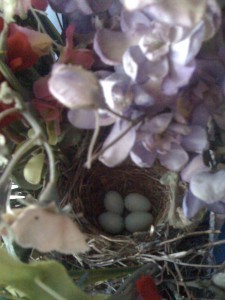 The whole reason for this post is to show this pic from the basket on our front door-those are eggs of our resident purple finches from last year!