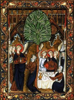 The Lord appeared to Abraham at the sacred trees of Mamre. As Abraham was sitting at the entrance of his tent during the hottest part of the day, he looked up and saw three men standing there. As soon as he saw them, he ran out to meet them. Bowing down with his face touching the ground, he said, “Sirs, please do not pass by my home without stopping; I am here to serve you. Let me bring some water for you to wash your feet; you can rest here beneath this tree. I will also bring a bit of food; it will give you strength to continue your journey. You have honored me by coming to my home, so let me serve you.”