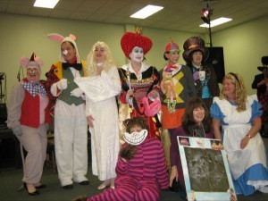 My favorites were the ladies who showed up as sorority sisters from The Help with their old pins and page boys, the Frida Kahlos (when you see eigfht women with unibrows and crepe paper flowers on top of their head there's no doubt), and the Alice in Wonderland Tea Party led by book cheerleader with a fully decorated and lit table. The winners, however, were the group who read Kathy Patrick's book, Pulpwood Queens, etc. dressed as the Queen herself—leopard caftans, matching orage wigs and pink feather boas.