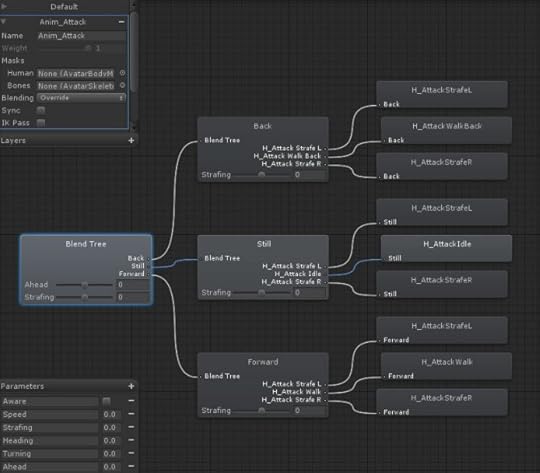 As a result, each character in Sir has a script that tracks the velocity, turn speed, strafe speed, heading and other motion values. These values are then sent to whatever current Mecanim layer we have activated on the NPC (we have a layer for each behaviour; attacking, fleeing, hunting, searching, roaming etc.). The blend trees in that layer then resolve the final animation mix that is appropriate for the characters current behaviour. This can result in a few rare hiccups where an animation crossfade happens at a non-ideal cycle point, but with careful setup of the blend trees and clever animation design such instances can be minimised.