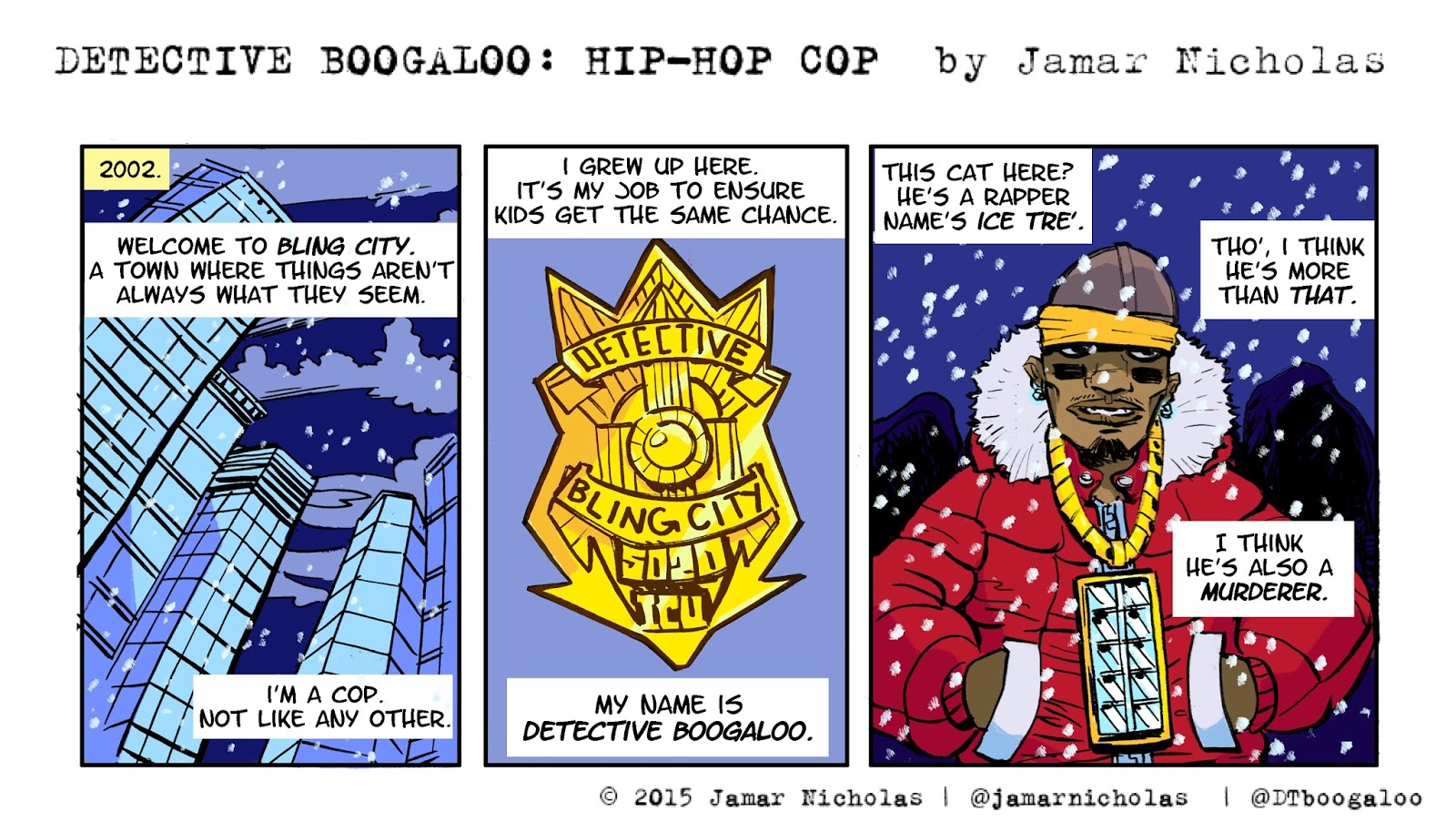 Another big marker is that I kept the strip frozen in the original time period--2002, where we reference that major bad guy ICE TRE' has a distinct look that is familiar with the rapper archetype of that era of hip hop.