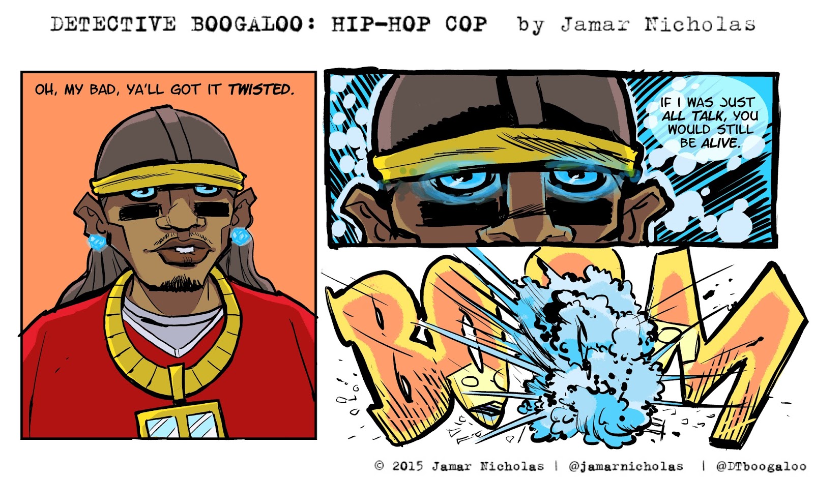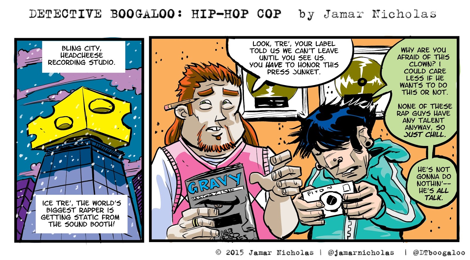 I consider DETECTIVE BOOGALOO a serial strip, a continuing story told a day at a time. "Hip Hop Dick Tracy" is a nice elevator pitch, with a strong but silent main lead, dealing with a world of off the wall villains. Not that much of a stretch, unless you're not interested in seeing that.