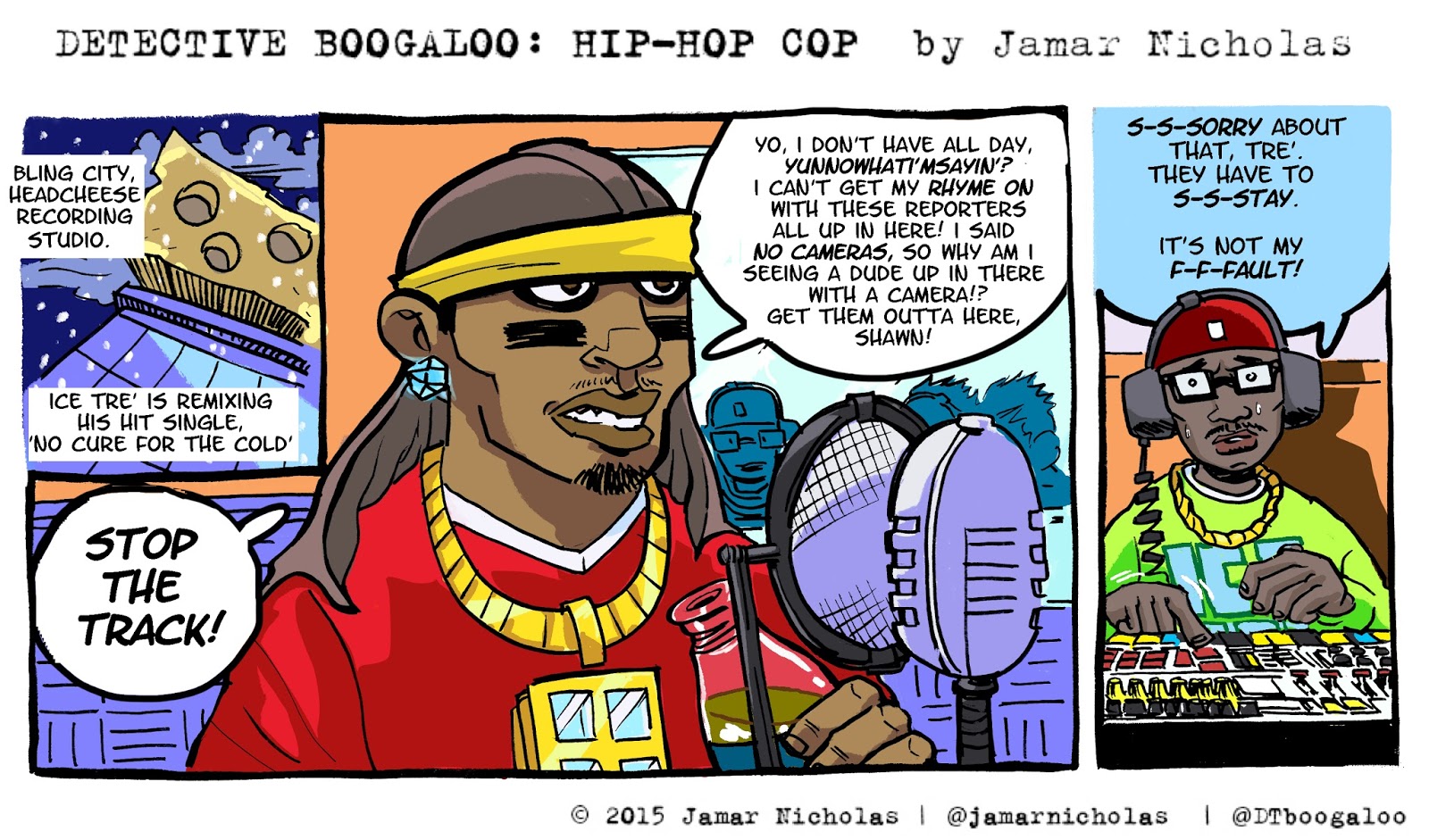 As the strip goes on, we see how we return to places in different points in time, and how people change and grow in those spaces. Ice Tre's producer, SHAWN is one of those people. His character to me, is a person who happens to be employed by a true gangster rapper-cum-super powered villain, and also your boss, which in my mind, sounds like a toxic work environment.