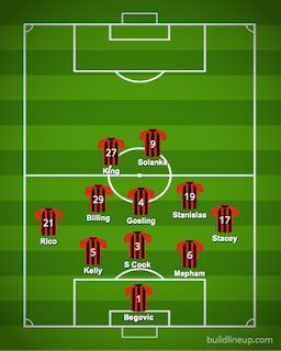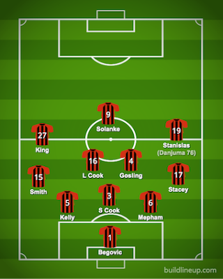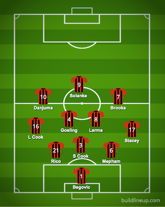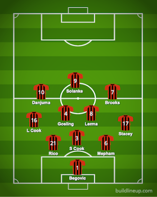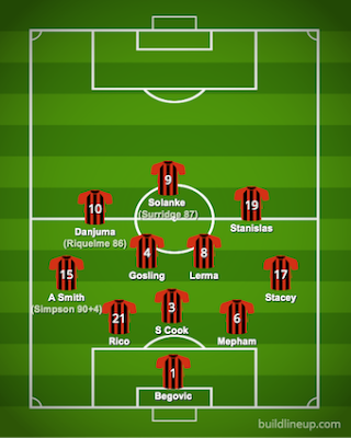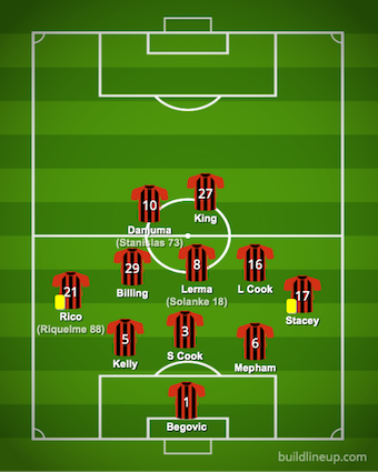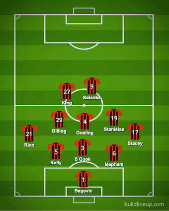 Jason Tindall revamped the side after two draws with four changes. In came Josh King for his first start this season, Phillip Billing and Lewis Cook started in midfield and Lloyd Kellly came in at the back. Out went Dan Gosling, Dominik Solanke, Junior Stanislas and Adam Smith