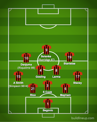 Jason Tindall brought Dan Gosling into the centre of midfield, Solanke started upfront, Adam Smith came into the left wing-back position and Junior Stanislas started on the right-wing. Jefferson Lerma was injured while Philip Billing, Diego Rico and Arnaut Danjuma moved to the bench.Advertisement