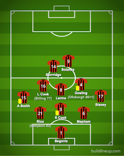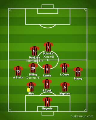 Bournemouth kept is 3-5-1-1 formation with both Stacey and Rico in the line-up. Lloyd Kelly didn't make the team, but Billing came into the side, leaving Danjuma to play behind Solanke. Josh King was on the bench but there was no David Brooks who was ill having starred in midweek.