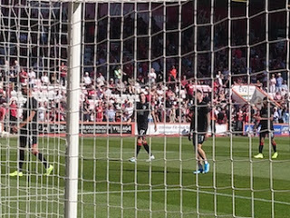 Stacey wins a corner. There will be another corner. Lots of headers and Surrdige puts a powerful header in and the keeper just stretches enough to keep it out. Steve Cook heads wide from the corner.