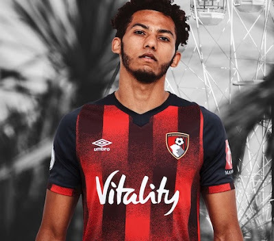 Official AFCB photo - Lloyd Kelly in the new home shirtThe shirt has a V-neck this time and UMBRO have kept the flashes in the sleeve sides of the short sleeve shirt. Mansion88 are still on the shoulder of the shirt, so they haven't ended their sponsorship entirely with the club. I'm not sure it is easy to get too excited about new shirts until you actually have the latest version on your back, which perhaps gives you a lift to know you have the latest replica shirt.