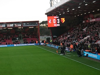 A bottom of the table clash.Are Bournemouth one of the worst three sides in the Premier League this season? On this showing, yes, they truly are. While hardly managing a shot in the first half, Bournemouth fell behind to a goal of their own making, by gifting Sarr the ball by playing out form the back and seeing Decouré clip the ball past Mark Travers. It only got worse with Troy Deeney lashing in a second goal on 65 minute, before Pereyra made Bournemouth suffer even more with a third goal in added time. Even Eddie Howe has run out of excuses for his players' poor performances.