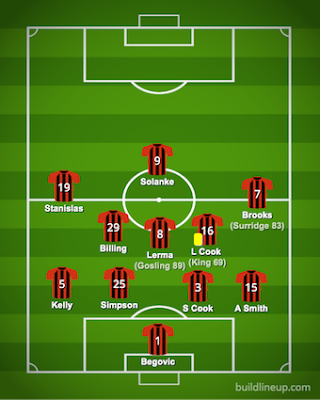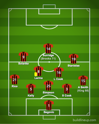 Begovic 8, Smith 6, S Cook 6, Simpson 6, Kelly 5, Brooks 5, Lerma 7, Billing 7, L Cook 7, Stanislas 5, Solanke 7