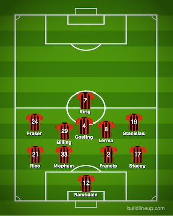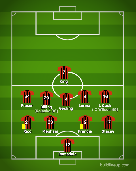 Ramsdale 5, Stacey 5, Francis 6, Mepham 5, Rico 4, L Cook 4, Billing 4, Lerma 5, Fraser 5, Gosling 4, King 6