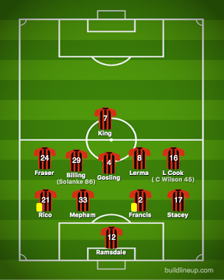 King and Wilson an fire AFCB back up the table.I feel there is a certain animosity growing between some fans and Callum Wilson. It's almost as if fans expect him to be able to turn it on in a flash. Even when he pulled up injured against Liverpool, some fans were wondering why he didn't chase harder for the ball. I don't see any lack of effort from Wilson though. He just needs chances. When they come he might not take the first one, but he rarely misses two or three.