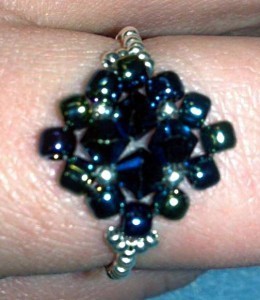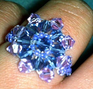 The second picture you see here is the Sunburst Ring. This ring took me about an hour to make; you can see from the close-up the reinforced stitches as I weaved back and forth through the transparent crystals.