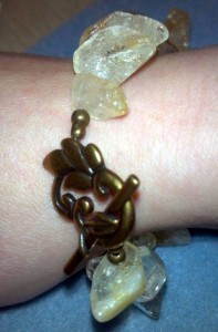 I started (and stopped) two other bracelets that were a lot more stitching oriented. Those require counting and focus, so I didn’t finish them. This last one is my favorite of the day. Citrine gemstones were on sale, so I picked up these and made a bracelet with Size 6 Clear Crystal Japanese beads. These are often used as filler in between other beads or in a beginner’s kit of beaded kumihimo. I love the texture of this one and — better yet — it’s supposed to signify “focus.” Whether or not that’s the case. . . Well, the sentiment is a nice one, anyway, and it feels good to wear natural stone.