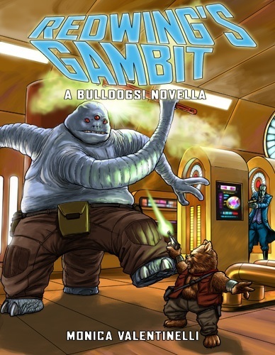 What you see here is not just the first peek at a cover for Redwing's Gambit, but a representation of a scene from my science fiction novella penned for the Bulldogs! RPG. I designed this story like a pilot episode to help you get to know a very large cast and crew. Talus, the ship's mechanic looms over Fang while a politician named Vincent Twist sneaks around the corner.