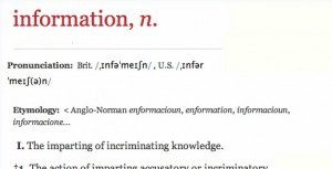 But no longer. This definition has been quietly demoted. Maybe the lexicographers thought it was too quaint. Now the Number One definition of information is “The imparting of knowledge in general.” I guess it’s hard to argue with that.