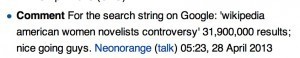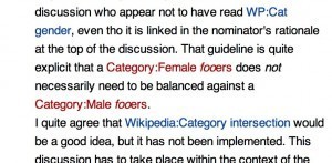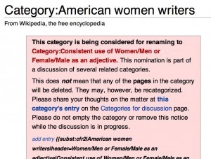 Which, of course, it was. Wikipedia is periodically accused of being a boys’ club. “Around 90 percent of Wikipedia editors are men, and it shows,” New Scientist said earlier this month. Many Wikipedians agree and would like to do something about it. A large majority of commenters voted “Merge.” Some deployed the terms “ghettoization” and “back of the bus.” Then again, a few are voting for ghettoization—or as they say, “Diffuse women but not men,”diffuse being the term for sending members of a parent category out into a subcategory. At least it’s arguable that “women novelists” is a category of cultural and sociological interest. It was noted that Wikipedia features an extensive article on Women’s Writing in English, as part of Wikiproject Gender Studies and Wikiproject Women’s History.