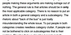 Heated argument broke out on a page set aside for discussion of changes to Wikipedia categories. Categories are a big deal. They are an important way to group articles; some people use them to navigate or browse.