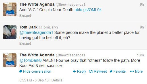 While Crispin lay near death, some of the bad guys she’d defended writers against, who in the past have settled for posting lots of outright lies about Writer Beware, were having a ghoulish celebratory party on Twitter. (Thanks to Jim C. Hines for this screen capture.)