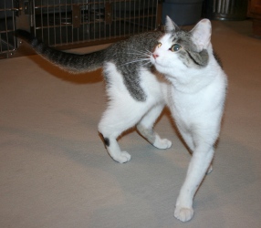 From the first, Bonnie hid. One of her favorite places was behind the refrigerator. She had a bell on her collar, and once the lights were out and we were in bed, we would hear her venturing forth. It took me so long to get her to venture forth voluntarily and sit on my lap to be petted, but once there, she decided that was where she always wanted to be. If I were doing some chore around the house and not paying attention to her, she would wind around my legs, scolding me.