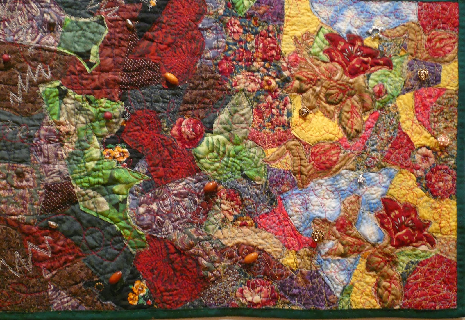 Detail of large art-quilt wall hangingThis leaves me with a sister, son, daughter-in-law-to-be, husband, a couple of friends, and my agent and editor to which to give handmade gifts—if I begin early enough. My sister, son, and other son’s fiancée also give me lovely handmade gifts for which I’m truly grateful, for which I’m truly grateful because I know how much time, effort, and money go into such gifts.Making homemade gifts is not necessarily a cheapskate activity. I make mine from high-quality cashmere, alpaca, quiviut, angora, mohair, brocades, silks, and satins, none of which are cheap at all. My sister makes me gorgeous bed and lap quilts from expensive beautiful combed cottons. My son knits with the same kind of fibers I use. My other son’s fiancée makes a wide variety of original, high-quality household items from topnotch materials. All of these gifts are much nicer than anything we’d buy to give.