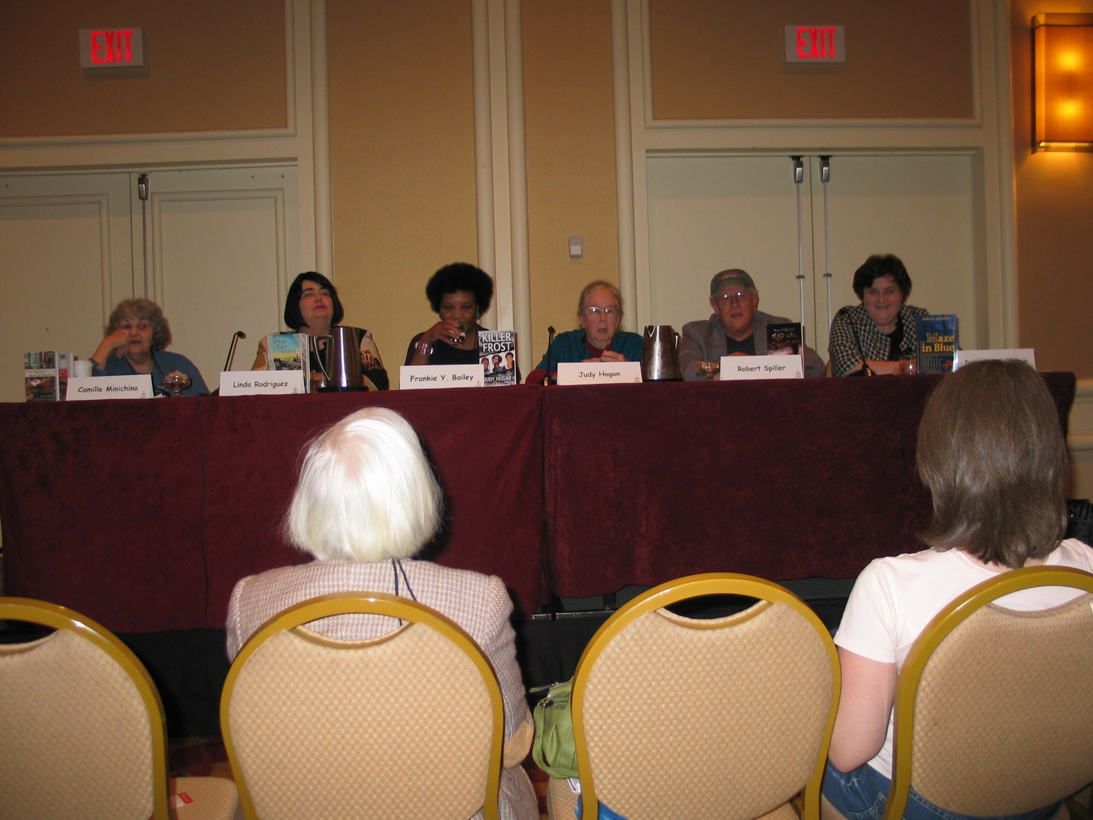 Photo by Valerie Bonham MoonEarly the next morning after my book launch, Ben and I took off by train for Malice Domestic 2012, a national mystery conference that takes place annually in the DC area. While there, I participated in the New Authors Breakfast and then moderated a panel called "Have Gun Will Travel: Mysteries Set Out West." In the weeks before the conference, I've introduced my blog readers to the fine writers on this panel, but here's a photo of all of us as the panel was taking place. This panel was a big hit with the audience laughing along with us as we played out a humorous give-and-take over the merits of the West as a setting for a book.