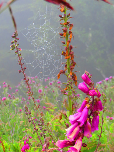Spider Webs. Wow. At the edge of a grassy pasture, foxgloves glittered in the fog. A spider web was hung with water droplets like a Christmas tree hung with lights. We stopped to look closer. Likewise, in your writing, enjoy the journey of writing a story. Don’t just look for the finished book or the pay check at the end. Instead–stop and look for spider webs. (Don’t you think that is much better than, “Stop and smell the roses”?)