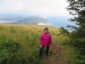Timing is important. We were disappointed not to be able to see the ocean from the top of Cascade Head, so a couple days later, we had some free time in the afternoon, instead of morning. We decided to head back to Cascade Head and try again. Sun shone brightly in the valley, but we saw a cloud hanging over the top of Cascade Head. Was it thick fog again? We pulled into the parking area and it was almost raining. We hesitated. We had been out there once; would we find nothing but fog again? Like in our writing career, you just have to try. You have to write that next novel or story, and you can’t give up. We climbed out of the car and took off.