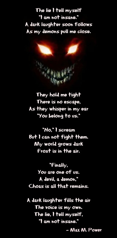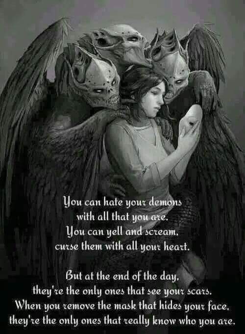 My demons may try to kill me but they know me better than anyone and will never leave me. - Max M. Power* Rarely will I use someone else's pictures without permission but whomever wrote this described it perfectly. I hope they don't mind I shared it with the world.