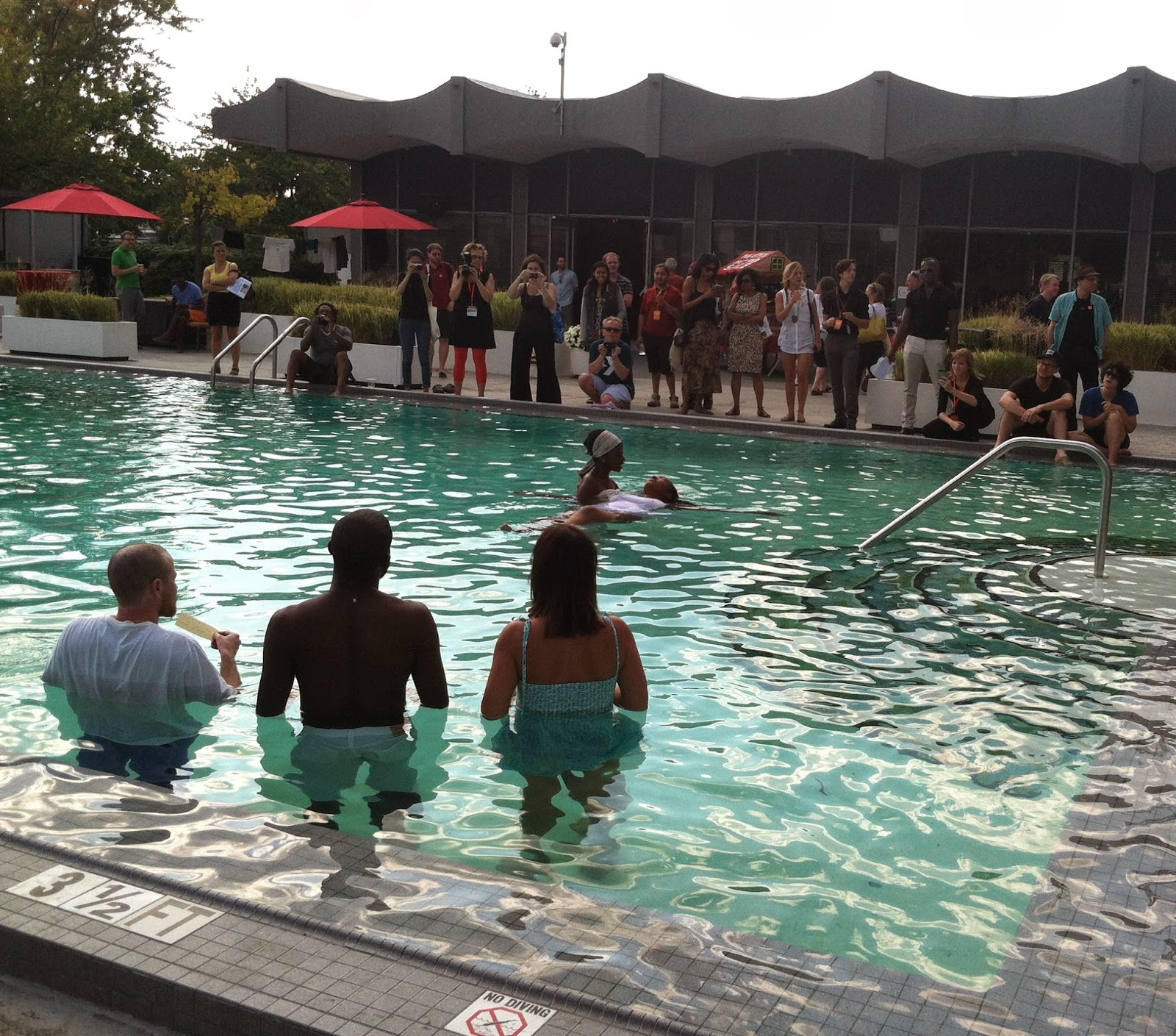 We made it back to DC and promptly collapsed into sore throats and grumpy unpacking. We rallied enough for this past weekend's (e)merge art fair, at the Capitol Skyline Hotel--right by the Nats baseball stadium--which belongs to the Rubell family. On Sunday we armed ourselves with bloody marys, and set to wandering. In the lobby Andrew Wodzianski was enacting a "Self Portrait as Jack Torrance," typing All work and no play makes Jack a dull boy over and over on a manual typewriter. Setting a different tone, the lovely Holly Bass was conducting an "Art Baptism" out by the pool, under a wind-whipped canopy, complete with community music.
