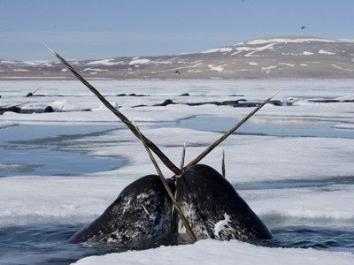 Narwhals frequent the waters of Greenland, Canada, and Russia. Each weighs between one and two tons, averaging 12 to 15 feet in body length. They dive deep and fast. Really deep: 2,400-4,500 feet. Really fast: they make the round trip in 25 minutes.