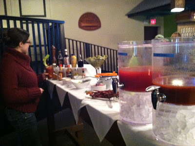 The next morning Traci, her husband Robert, Jill Osier (the other KBAC reader), and I headed out to South Haven, a beach town about an hour away. On the drive out we saw Christmas tree farms, fields of bare blueberry bushes with bright red branches against the snow, a 20-foot-tall compound bow advertising an archery shop, and the place that sells "The World's Greatest Hamburger," which as you can imagine was quite the temptation. But we pushed on to the Thirsty Perch, which had good hot french fries and this Make-Your-Own Bloody Mary bar. Celery salt, two different varieties of hot sauce, horseradish, thick crisp bacon: we were in heaven. But what followed was even better.