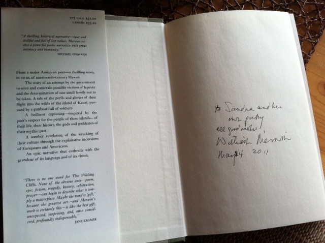 The best book I ever received for Christmas is a first edition of W. S. Merwin's THE FOLDING CLIFFS, "a narrative of 19th-century Hawaii"--in other words, one of the great epic poems written in our time. In elegant, urgent verses Merwin tells the story of a family determined to stay together as they flee government capture during a quarantine effort on Kauai. Woven in amidst the action is an appreciation of the native culture, mythology, and landscape of this gorgeous island. The book is dedicated to Olivia Breitha (1916-2006); Breitha was known as an outspoken advocate of those discriminated against for leprosy, and her firsthand experience resonated with later generations affected by the AIDS epidemic.