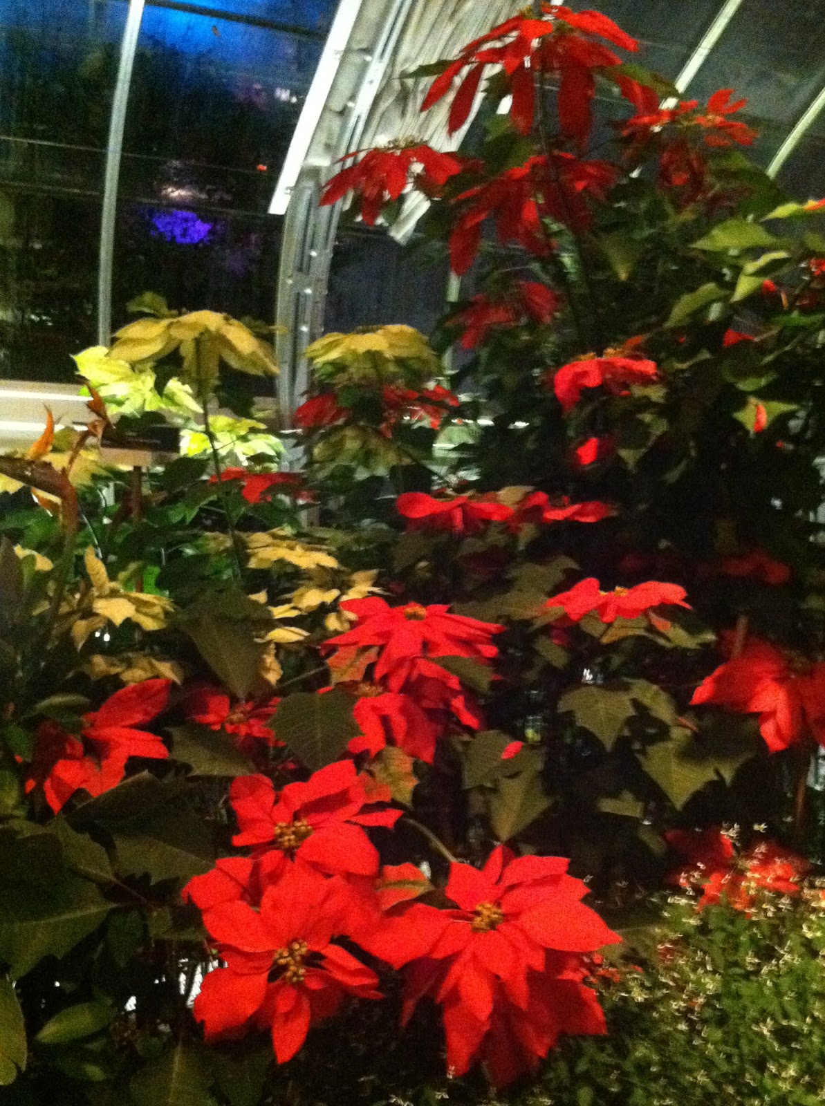You know how goldfish, if they are not limited by the size of their bowl, continue to grow bigger and bigger and bigger? Poinsettias are the goldfish of the holiday plant world. They can easily reach six feet tall and keep growing. You have to admire their ambition. If you want to drop by the Botanic Gardens, it is not too late. They'll continue to have their extended hours on Tuesday, December 27 (Hot Club of DC, gypsy jazz and swing) and Thursday, December 29 (40 Thieves, Irish rock music). Tell 'em I sent ya. And for a grand finale, as promised, a little live action filmed by yours truly: