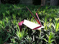 The next morning I taught a workshop on sestinas called "The Gyroscope of Form." I had a class full of ringers--Richard heavily encourages his private students to attend. It was a delight to look at examples from Philip Sidney, Elizabeth Bishop, Miller Williams, and Sonya Huber, tracking the evolution of tone, lineation, and flexility of endwords through the styles of different eras. We talked technical challenges. I shared examples of my strategic process. We drafted sestinas (or at least, the first stanza) using a pool of endwords that included "blue," "cellar," and "hermaphrodite." One participant, Kit, was inspired by the origami poems I'd read the night before to bring in her fancy papers and fold me a shrimp. On the spot. I wanted to say Can I keep all of you?