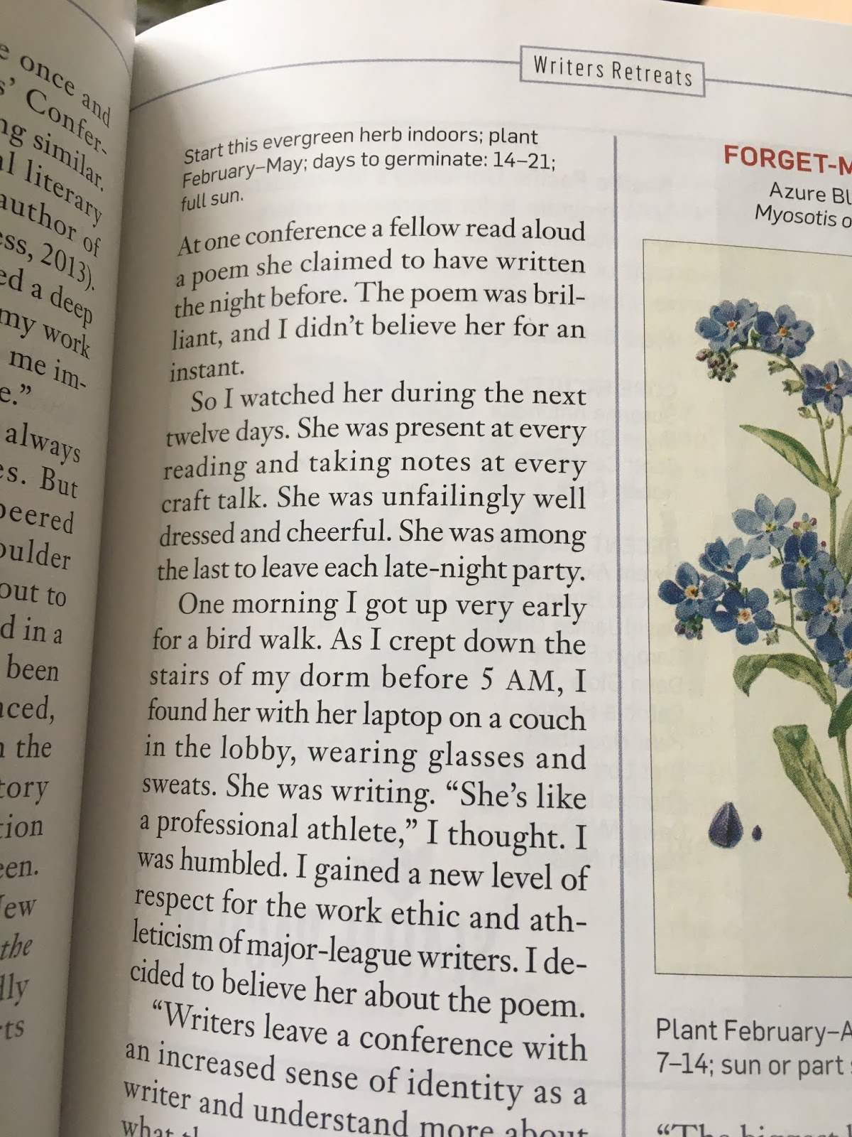 One morning I got up very early for a bird walk. As I crept down the stairs of my arm before 5 AM, I found her with her laptop on a couch in the lobby, wearing glasses and sweats. She was writing. 'She's like a professional athlete,' I thought. I was humbled. I gained a new level of respect for the work ethic and athleticism of major-league writers. I decided to believe her about the poem."