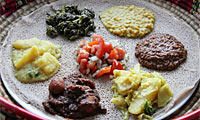 Anyway, last night we went to Ethiopic. DC is renowned for its Ethiopian food, mostly available in a 9th & U Street NW DC neighborhood at the edge of Shaw sometimes referred to as "Little Ethiopia." Ethiopic isn't putting on any great pretensions--they left a bullet hole in the front door handle, evidence of the neighborhood's not-too-distant past--but they've distinguished themselves at the outset by furnishing their space with spare, modern wood furniture (though traditional messob woven-basket tables are available) and offering a menu that offers spicier variations on the traditional dishes.
