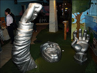 Afterwards we headed down nine blocks to H Street Country Club, whose astro-turfed portico hints at its prize jewel: an upstairs nine-hole mini golf course. Thought the putting greens are short, there's enough variety in the design to keep you interested, and the course's artsy sculptures all have a DC theme (K Street robot-lawyers; the undead Presidents; King Kong scaling the Washington monument). Fritz Hahn did a great play-by-play for The Washington Post and took this shot of a hole that combines two great icons--the majestic sculpture of "The Awakening" that used to live in Hains Point and now resides out by the National Harbor, and, um, politician Marion Barry.