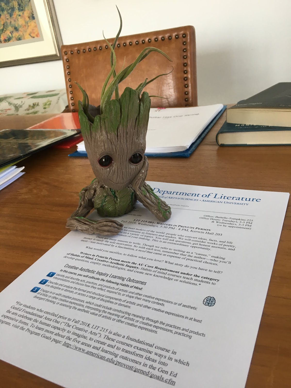The planting has been going on figuratively, too. I am leaving the summer with a nonfiction manuscript of lyric essays in hand, as the wheels turn on the next poetry collection. The fall is teeming with teaching responsibilities. For the University of Tampa: thee nonfiction students, two in their thesis semester. For places outside the academy: a three-session arc at Politics and Prose (poetry), and a four-week online class for 24 Pearl Street (nonfiction). For American University: my usual undergraduate session of Writers in Print / in Person, and teaching the graduate poetry workshop--a classroom space I first entered as an MFA student, 17 years ago. Bringing some apartment life into my campus office felt like a good idea, so I got a baby-Groot inspired holder for one of our air plants.