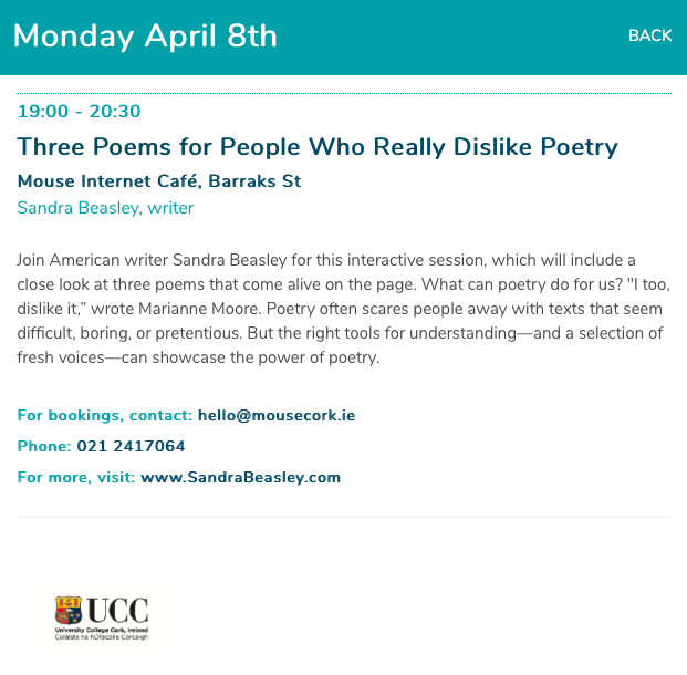 Turns out that in addition to wrapping up finals grading at UCC and working with my community mentees, I have one more unexpected teaching opportunity on the docket. As part of the daily prep and handout-making for the festival workshop, I made friends with the good folks at Mouse Internet Cafe. So when I found out that an instructor had cancelled on them for an event scheduled as part of the Cork Lifelong Learning Festival, I offered to step in. If you happen to be in Cork on Monday, April 8, come hang out with us at 7 PM (location on Barracks Street near the Southgate Bridge). We'll be discussing "Three Poems for People Who Really Dislike Poetry."