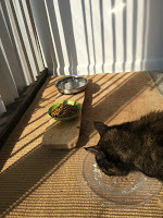 Many of my worries about what might happen in going to Ireland did not come true--they were phantoms, nothing more--but one did come true: Whisky, our beloved cat, lost weight. She is not a cat who could afford to lose weight. (Look at those jutting hip bones in the photo below. Good lord.) She missed us, despite three superb cat-sitters. I've been trying to bring her back from the brink one bite of food at a time, which entails many pets.